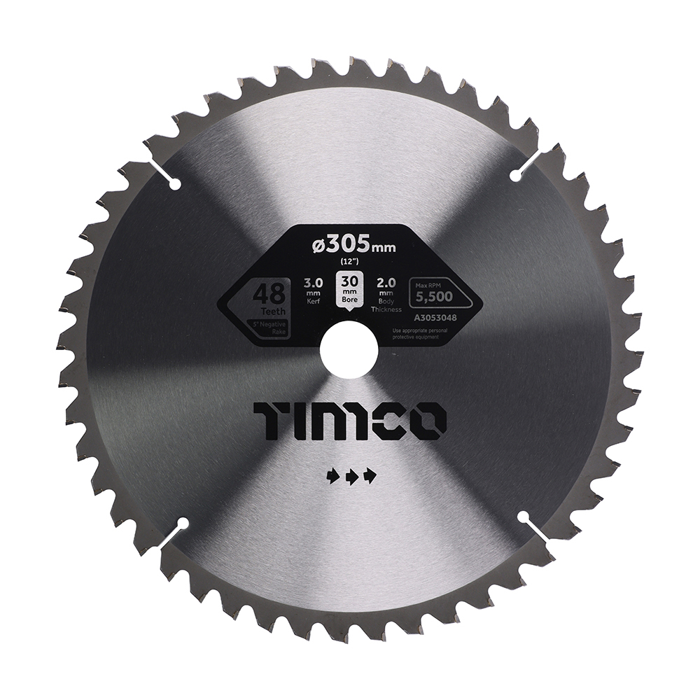 Pack Qty 1 Pack Type Clamshell Blade Body Thickness (mm) 2 Bore (mm) 30 Brand TIMCO Cut Type Fine Disc Ø (inch) 12 Disc Ø (mm) 305 Kerf (mm) 3 No. of Teeth 48 Pack Dimensions L x W x H (mm) 10 x 345 x 400 Pack Weight (kg) 1.26 Substrates Plastic, Aluminium