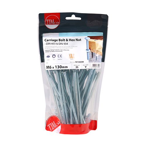 Timco Bag of 35 x Carriage Bolt & Hex Nut – BZP – M6 x 130 – 06130CBB
