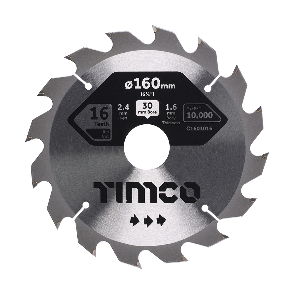 Pack Qty 1 Pack Type Clamshell Bore (mm) 30 Brand TIMCO Bushing Ring Size (mm) 16 Cut Type Coarse / Medium Disc Ø (inch) 6 1⁄4 Disc Ø (mm) 160 Included Items 16.0mm Bushing Ring (Qty 1) Kerf (mm) 2.4 No. of Teeth 16 Substrates Hardwood, Exotic Timber, Stone Fibre Board
