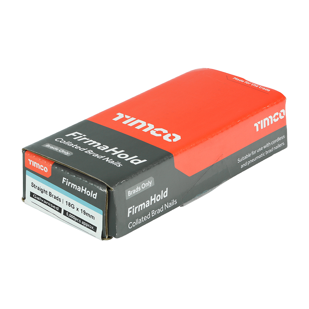 Gauge 18 Point Type Diamond Pack Dimensions L x W x H (mm) 142 x 66 x 26 Material Carbon Steel Collation Angle Straight Corrosion Rating (1-5) 2 – Occasionally damp/wet, rural and sheltered areas Pack Weight (kg) 0.86 L (mm) 19 Pack Type Box Pack Qty 5000 Nails Per Strip 100 Finish Galvanised Substrates Skirting, Architrave, Tongue & Groove Head Type T Head Brand TIMCO