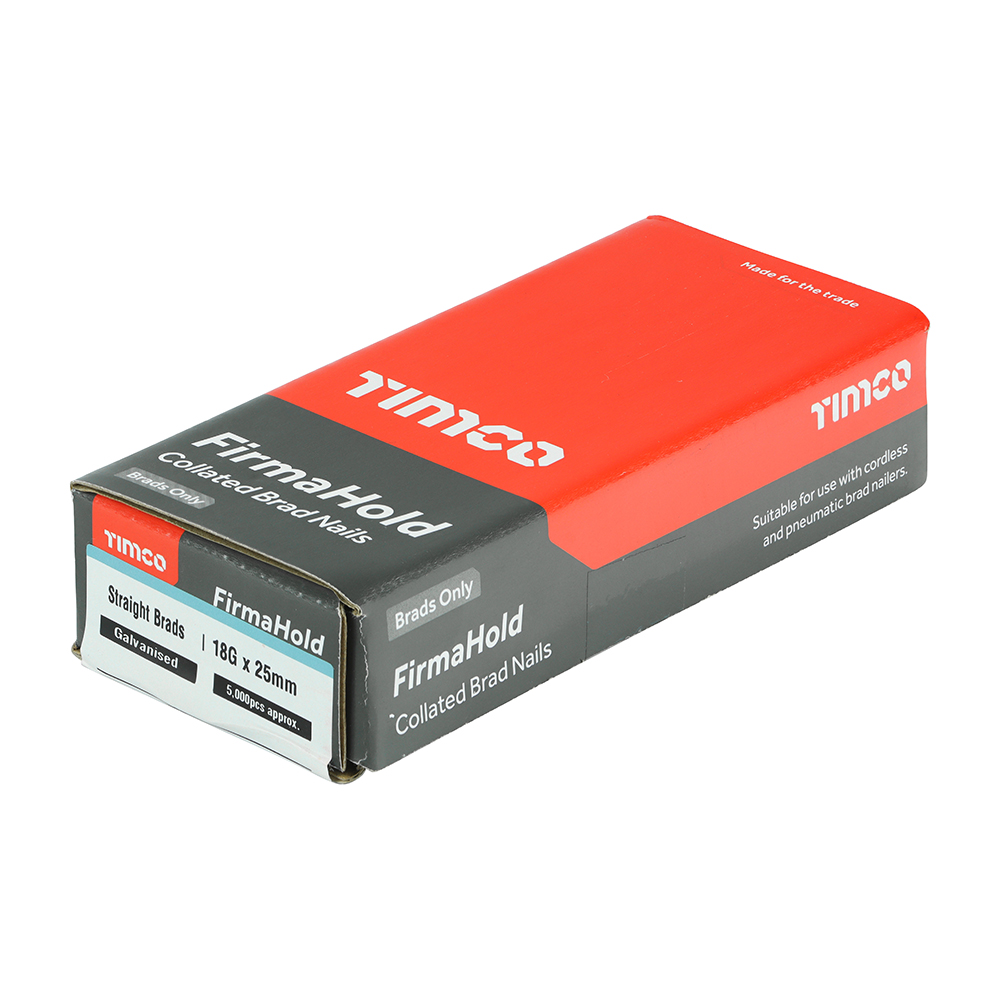 Gauge 18 Pack Weight (kg) 1.13 Material Carbon Steel Finish Galvanised Collation Angle Straight Pack Type Box Pack Qty 5000 L (mm) 25 Pack Dimensions L x W x H (mm) 142 x 64 x 32 Nails Per Strip 100 Corrosion Rating (1-5) 2 – Occasionally damp/wet, rural and sheltered areas Head Type T Head Substrates Skirting, Architrave, Tongue & Groove Point Type Diamond Brand TIMCO