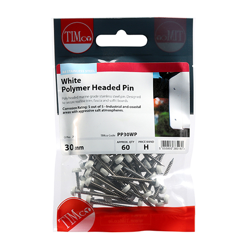 Impact and UV resistant A4 Stainless Steel polymer headed pins, used for fixing soffits, fascias, roofline trims and where other aesthetic fixings are required. 60 Pieces